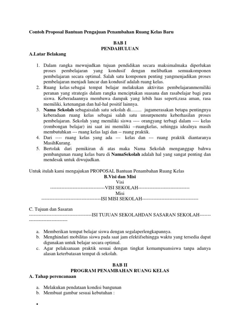 Contoh proposal bantuan pengajuan penambahan ruang kelas baru bab i pendahuluan a.latar belakang 1. Proposal bantuan dana pembangunan ruang kelas baru paud. Bersama ini, kami selaku ketua yayasan nurhanifah buninagara mengajukan permohonan bantuan dana tahun 2019 untuk pembangunan ruang kelas madrasah aliyah . Akta kepemilikan status tanah yang akan dibangun. Maka dengan ini kami sampaikan permohonan (proposal) bantuan dana untuk ruang kelas baru (rkb).